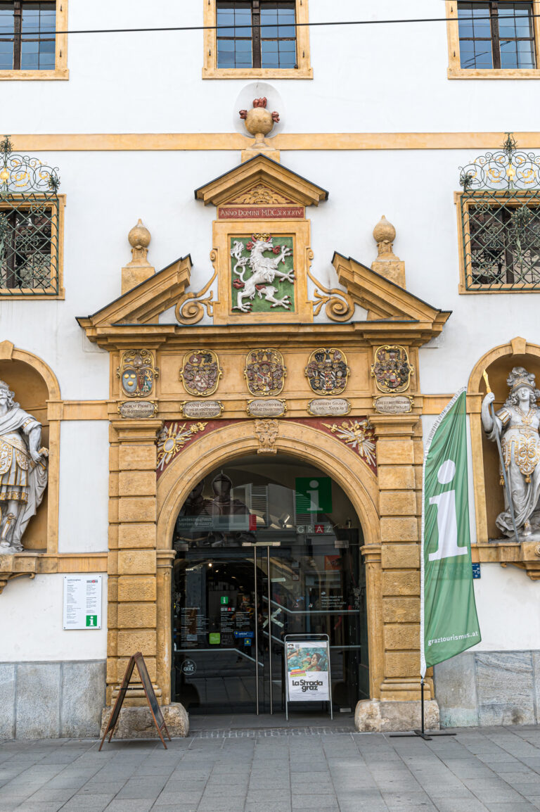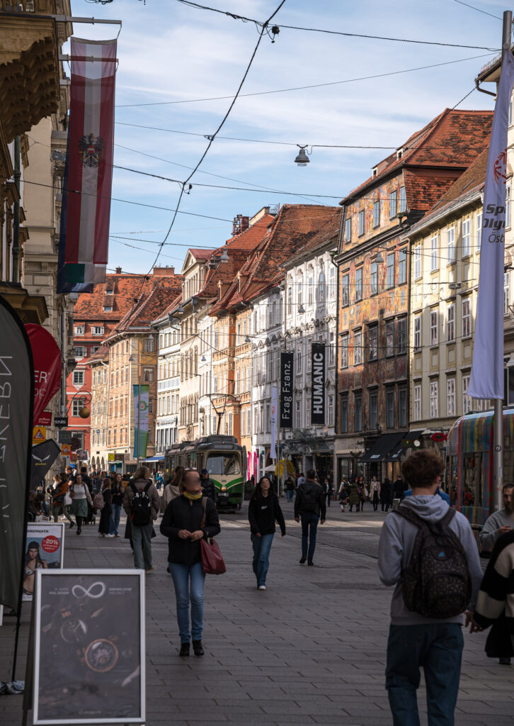Ich bin mitten im Gewusel der Herrengasse – die zentrale Einkaufsmeile von Graz und blicke von der Touristeninformation nach Norden. Um mich herum pulsiert das Leben, eine Tram bahnt sich ihren Weg. Die Fassaden sind farbenfroh, abwechslungsreich und verströmen Geschichte; Stromleitungen überspannen die Straße.