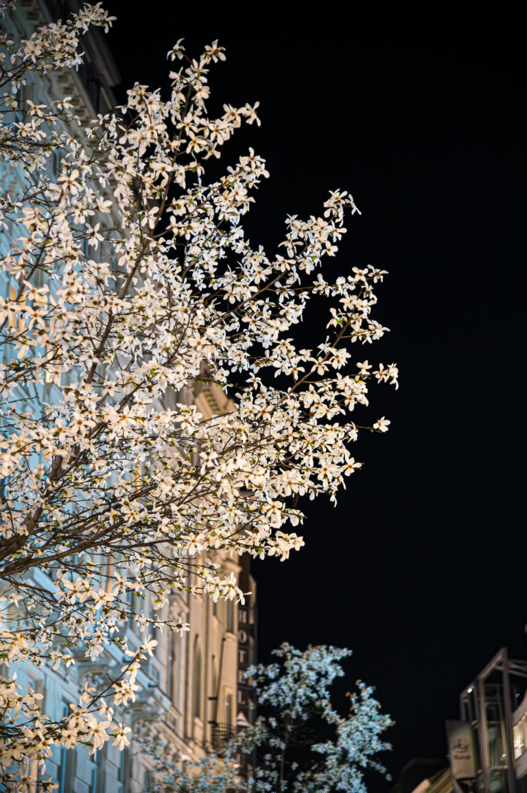 Lichter überall. Die Bäume bekommen langsam ihr Frühlingskleid. Fassaden unterschiedlicher Architektur säumen die gepflasterte Straße. Eines haben alle Häuser gemein: sie streben massiv dem Himmel entgegen. Ob der Uhrzeit ist recht wenig los.