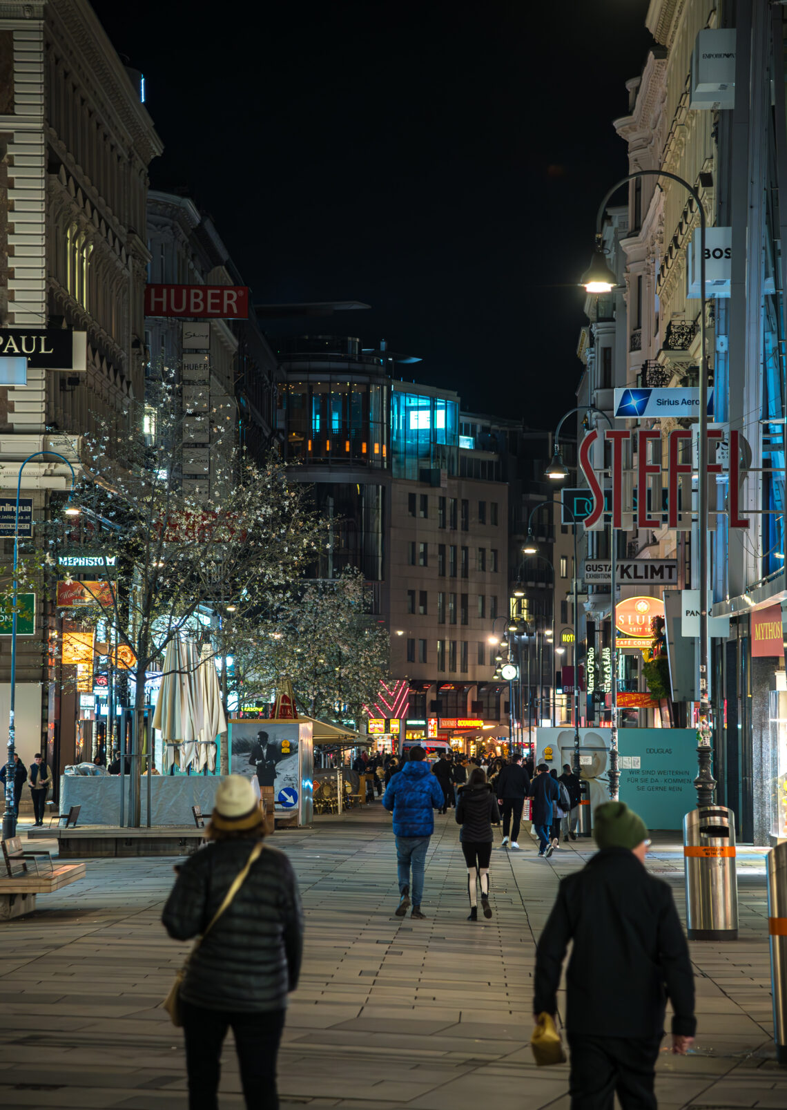 Ich bin auf dem Rückweg von einer nächtlichen Foto-Session auf dem Cobenzl und spaziere langsam durch die Haupt-Geschäftsstraße Wiens, die Kärntnerstraße. Die vielen Lichter und die erstaunliche entspannte Stimmung laden mich zu dieser Aufnahme ein.